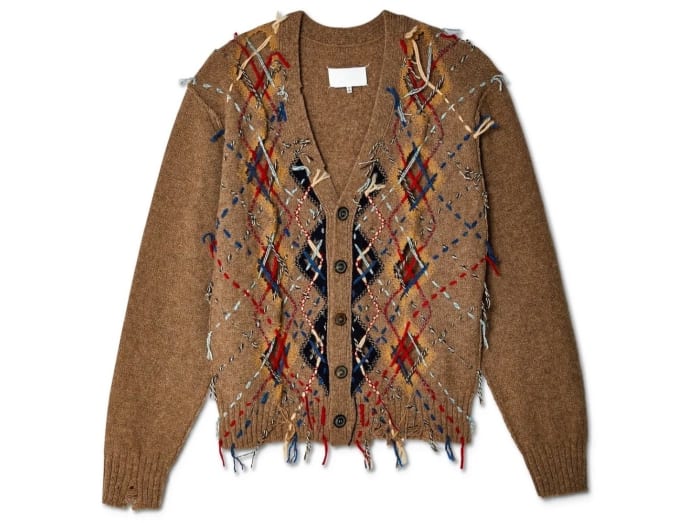 - Deliberately frayed threads and distressed details play on traditional argyle pattern