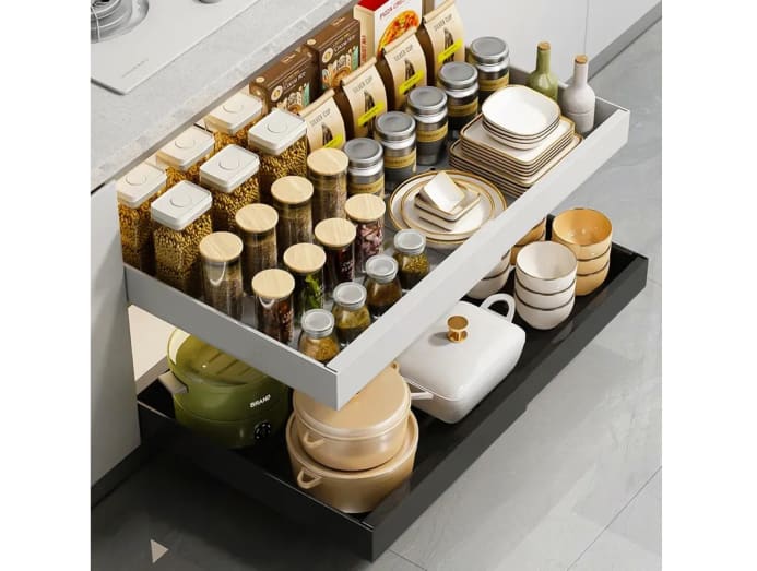 These adjustable pull-out drawers (width 32-52cm) are available in a variety of sizes and designs. They make it easy to find items at the back of cupboard shelves. Best of all for the DIY-challenged, they don’t need to be drilled into shelves thanks to heavy-duty double-sided tape that secures the drawer mechanism to your shelf.