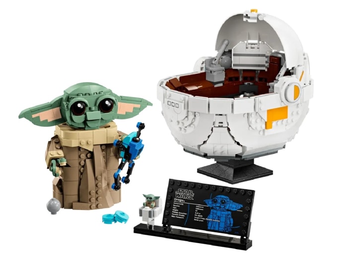 Grogu fans will appreciate this detailed set, which includes his hover pram. Grogu features dial-operated arms a posable head and ears. He can also be displayed in or out of the hover pram. The set includes a brick-built Sorgan frog, a shifter knob, and a cookie for Grogu to hold.
