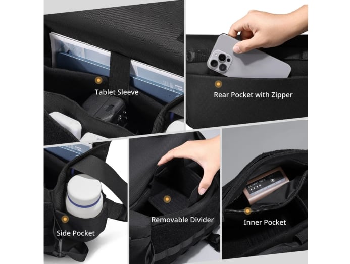 - Organisation: 1 tablet sleeve, 1 main compartment, 1 zippered inner pocket, 1 zippered rear pocket, 2 side pockets, 1 Removable Divider, bottom and side carrying straps
