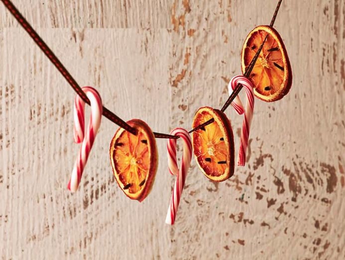 Slice oranges thinly and bake at a maximum temperature of 90 degrees Celsius for about four hours until they are dried out. String them up or use them as individual ornaments for the Christmas "tree". You can also use cloves and cinnamon sticks as embellishments – as an added bonus, they’ll make your house smell like a warm, toasty Christmas.