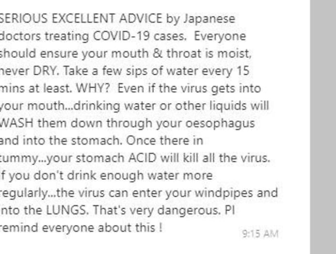 An example is a forwarded message that claimed drinking or gargling warm water with salt or vinegar can wash down the coronavirus. The Ministry of Health had specifically debunked this.