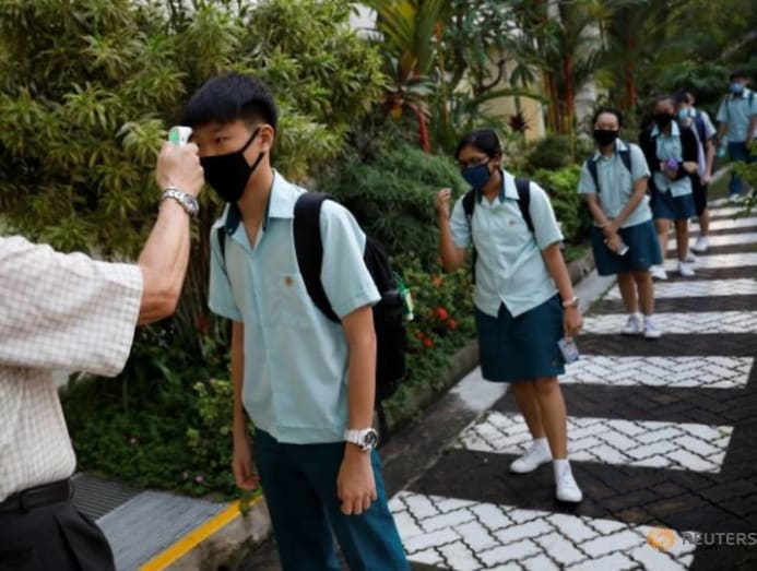 A teacher explains to students the new protocols for taking recess breaks and daily temperature checks at Yio Chu Kang Secondary School, as schools reopen amid the coronavirus disease (COVID-19) outbreak in Singapore Jun 2, 2020. (Photo: REUTERS/Edgar Su)