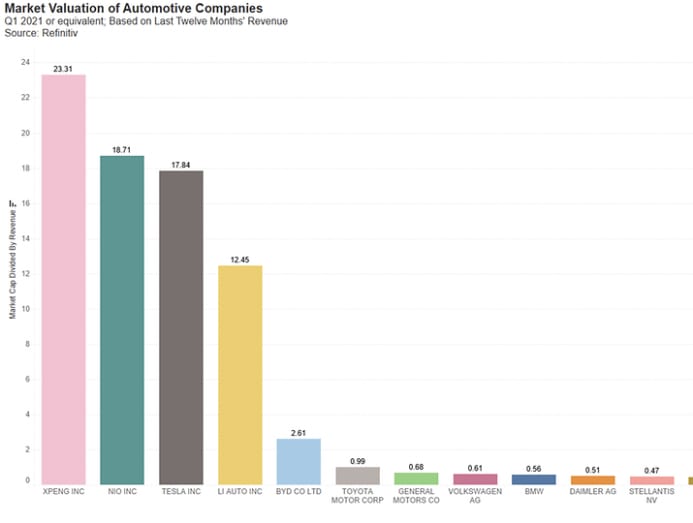 Today, it’s commanding an almost US$100 billion valuation. Following closely are Daimler, GM and Nio, hovering above US$80 billion.