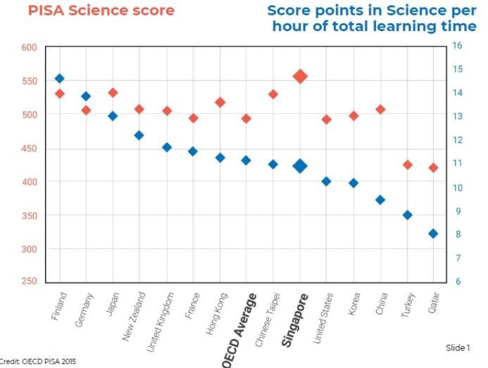 Fortunately, if you look at the red dot which is Singapore, we are an outlier – our students study more than their peers in many other countries but we score exceptionally well, which is the Singapore DNA.