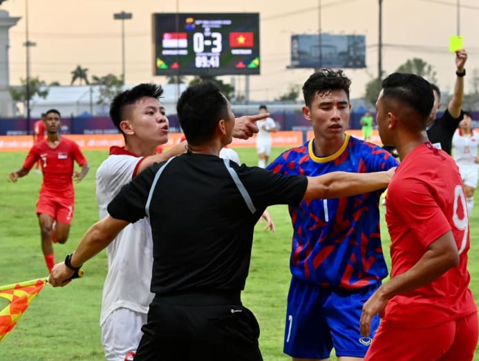 Singapore's footballers react after conceding a goal in a 3-1 defeat by Vietnam at the 32nd Southeast Asian Games on May 3, 2023. (Photo: CNA/Jeremy Long)