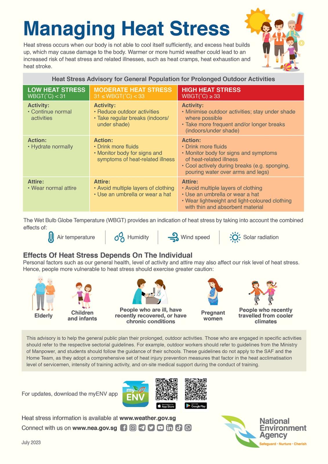 Singapore’s heat stress advisory uses a measure of heat called the Wet Bulb Globe Temperature (WBGT). Besides temperature, it accounts for the effects of humidity, solar radiation and wind, providing a more accurate measure of what conditions actually feel like and their potential health risks.