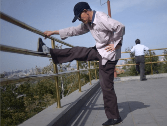 Elderly and middle-age people exercise with wooden dumbbells during a health promotion event to mark Japan's Respect for the Aged day. (Photo: Reuters)