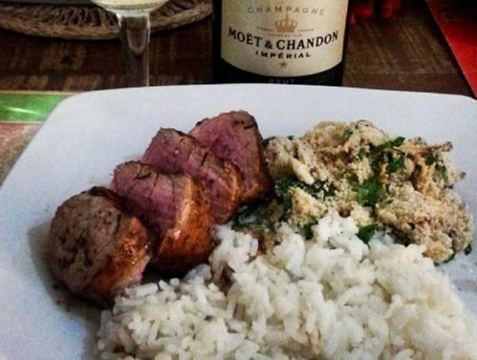 Favourite culinary come-on: Pork filet mignon marinated in molasses, white wine and aromatics, served with a side of rice and manioc flour fried in brown butter and banana.