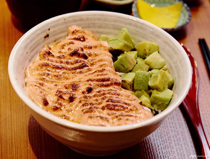 Sashimi-grade salmon, draped over rice and topped with a blanket of torched mentaiko mayo and diced avocados. It’s standard crowd-pleasing Japanese fare, but we say it’s the butadon that is the star here.
