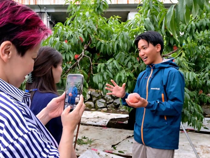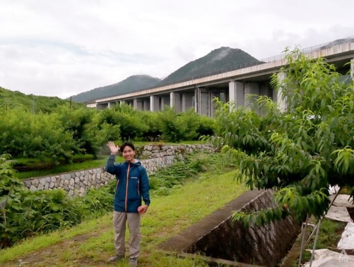 And yet, there I was at a peach orchard somewhere in the agricultural town of Ichinomiya in Yamanashi Prefecture – with cars driving past overhead as third-generation farmer Kenichi Watanabe welcomed us with a plump white peach in hand and a crash course on growing his precious fruits.