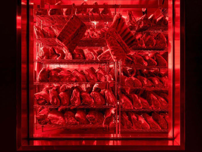 In the American outlets, Cote’s beef is aged between a week to over four months in dry-aging rooms, sultry neon red-lit spaces. Slabs of meat are hung there for customers to admire up close.
