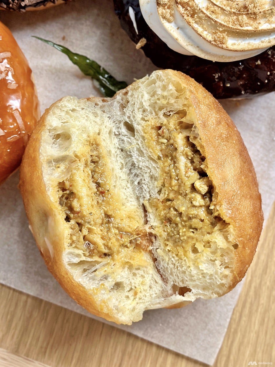 We are tickled by its name (remember “mee siam mai hum?”), and this hum-less "laksa" doughnut comes with a chunky chicken filling that reminds us more of chicken curry than laksa. But it’s pretty fun to gnaw through the fluffy, slightly crispy fried doughnut to get to the lemak-enough filling (which we could do with more of).