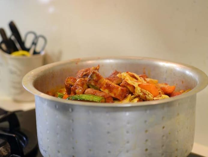 Then she adds the meat and vegetables – “You cannot be stingy with the ingredients, you have to put lots and lots” – and boils them with water.