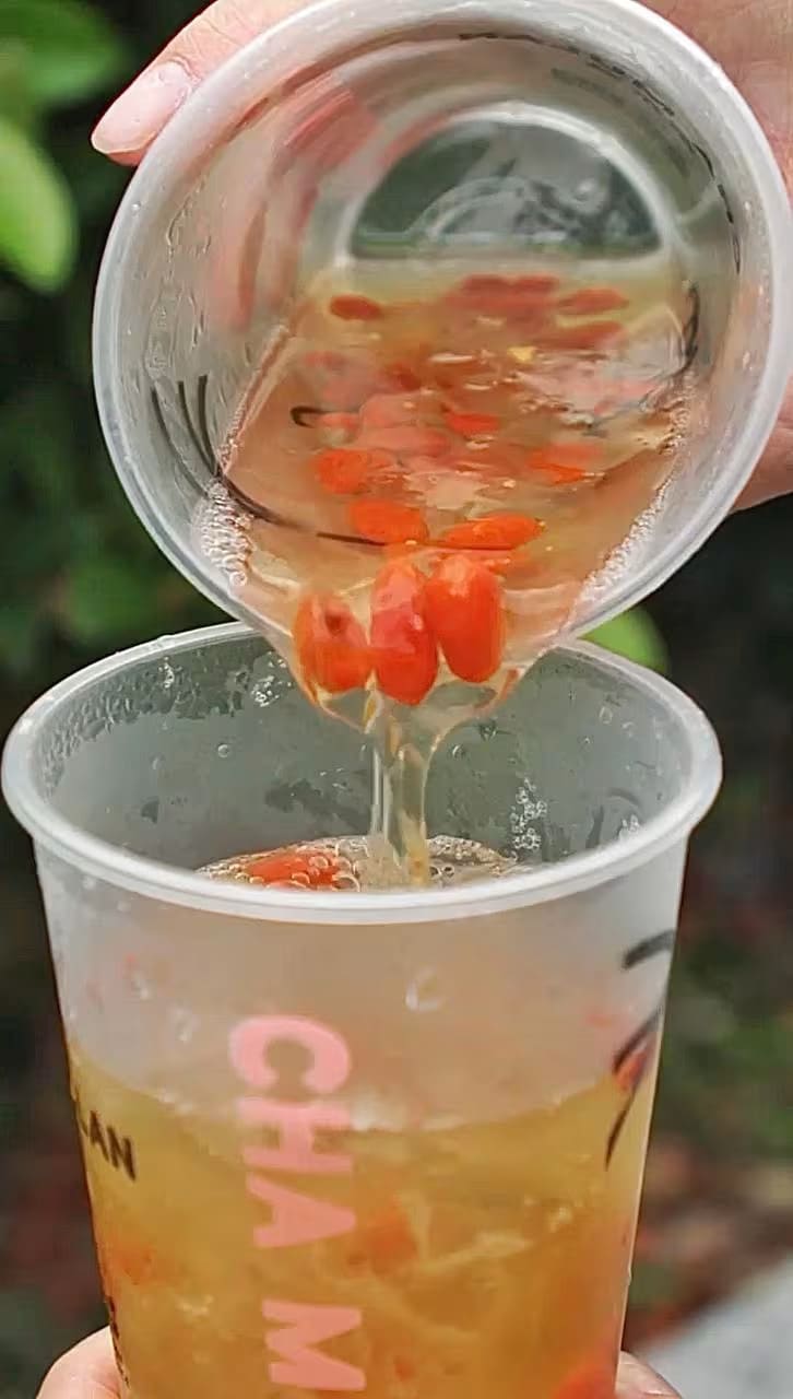 While it’s served in cute cups reminiscent of those from bubble tea shops, this isn’t your typical bubble tea – there are no tapioca pearls or popping boba here. Instead, think of it as tong shui (Cantonese-style soupy desserts) with TCM benefits plus tea in a cup, offering a similar sip-and-chew experience with nourishing ingredients like goji berries, peach gum, poached pears and snow fungus. But like bubble tea, the sugar level here is customisable.
