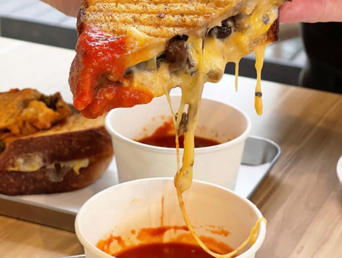 The toasties are served with a small serving of complimentary tomato soup, and customers can add on kimchi or caramelised onions to their toast for S$2.