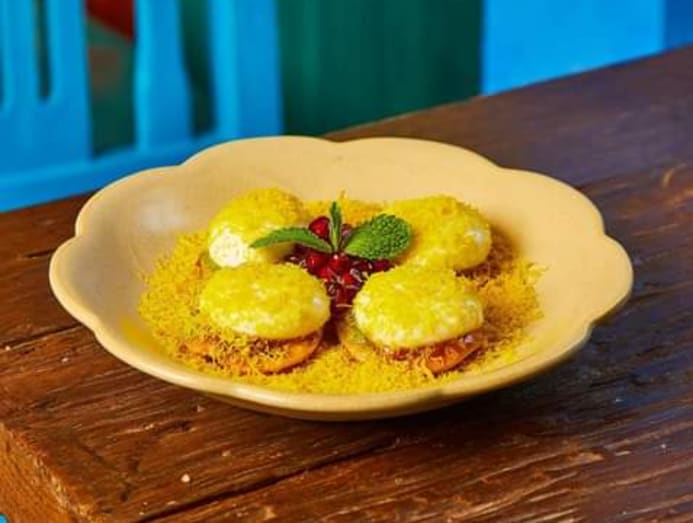 Which is why in a very casual but fun setting like Ms Maria & Mr Singh, diners can expect a rendition of some of the greatest hits served at Bangkok’s Gaggan Anand restaurant such as Papdi Chaat (S$28), a yogurt explosion of flavours featuring the popular Indian street food made with crisp fried puri, sweet and sour chutneys, yogurt and sev.