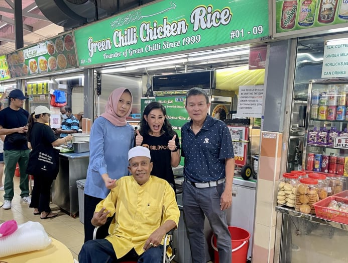 Mediacorp Gold 905 DJ Denise Tan gets in line with the private hire driver who discovered unique green chilli chicken rice at Sims Vista Food Centre, in his childhood neighbourhood.