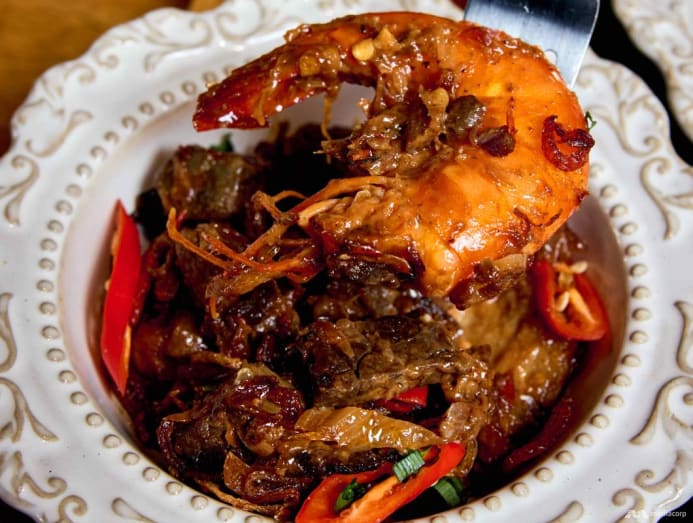 We chose the Sambal Goreng Pengantin as our main, a luxed-up version of the classic dish featuring juicy prawns and tender beef lungs in a robustly spiced, earthy sauce.