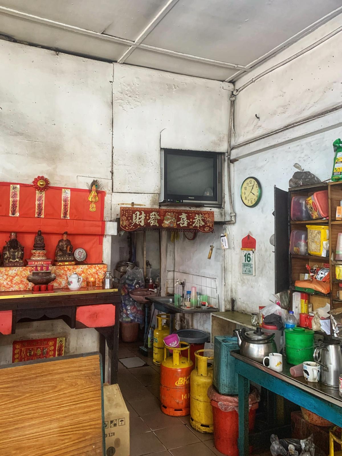 The interior of Kim Wah is wonderfully make-do Malaysian. The kitchen is partly under a makeshift mezzanine, resulting in a doorway with 1.75m clearance (including the Chinese New Year banner still hanging over). On a wall is the remains of a booth providing bench seating for a table. The regulars complete the tableau for maximum ahpek-ticity.