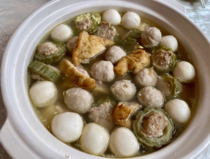 The first version appeared to be a simple but substantial soya bean-based soup packed with meatballs, fishballs, firm tofu, tofu puffs and bittergourd stuffed with a minced pork mixture. The latter ingredient is ku gua in Mandarin, ku meaning bitter.