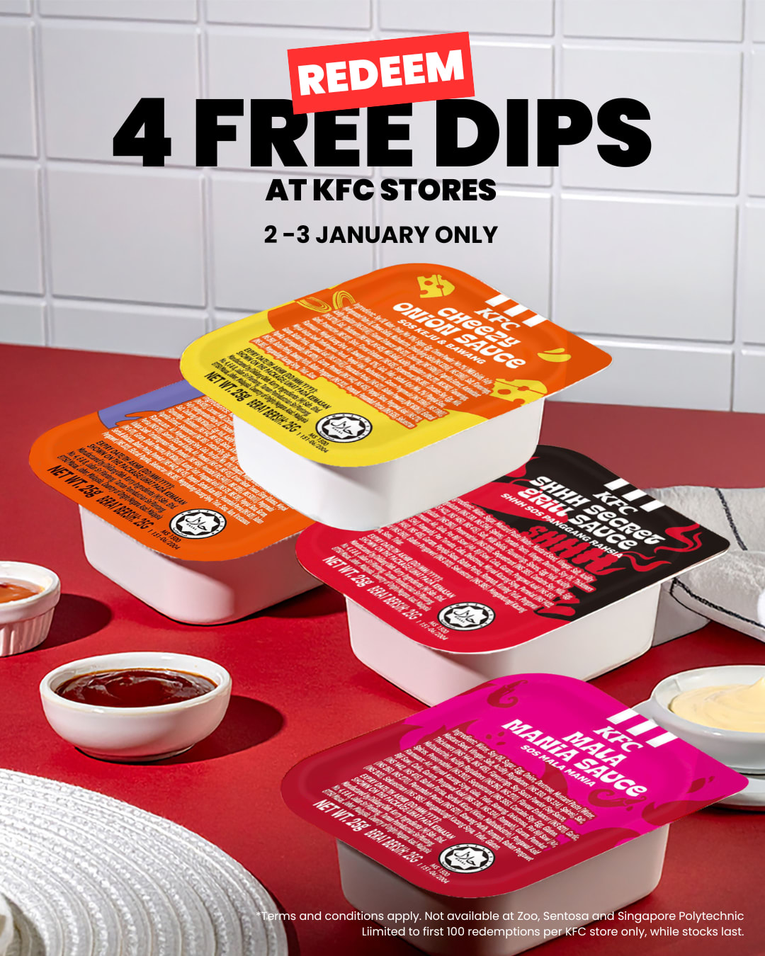 From Jan 2 to 3, customers can enjoy all four sauces for free when they purchase any Chicken Bites Meal, OR Tenders Meal or DoubleDip Platter Meal. Do note that the offer is limited to the first 100 redemptions per store and is only available for dine-in and takeaway orders.