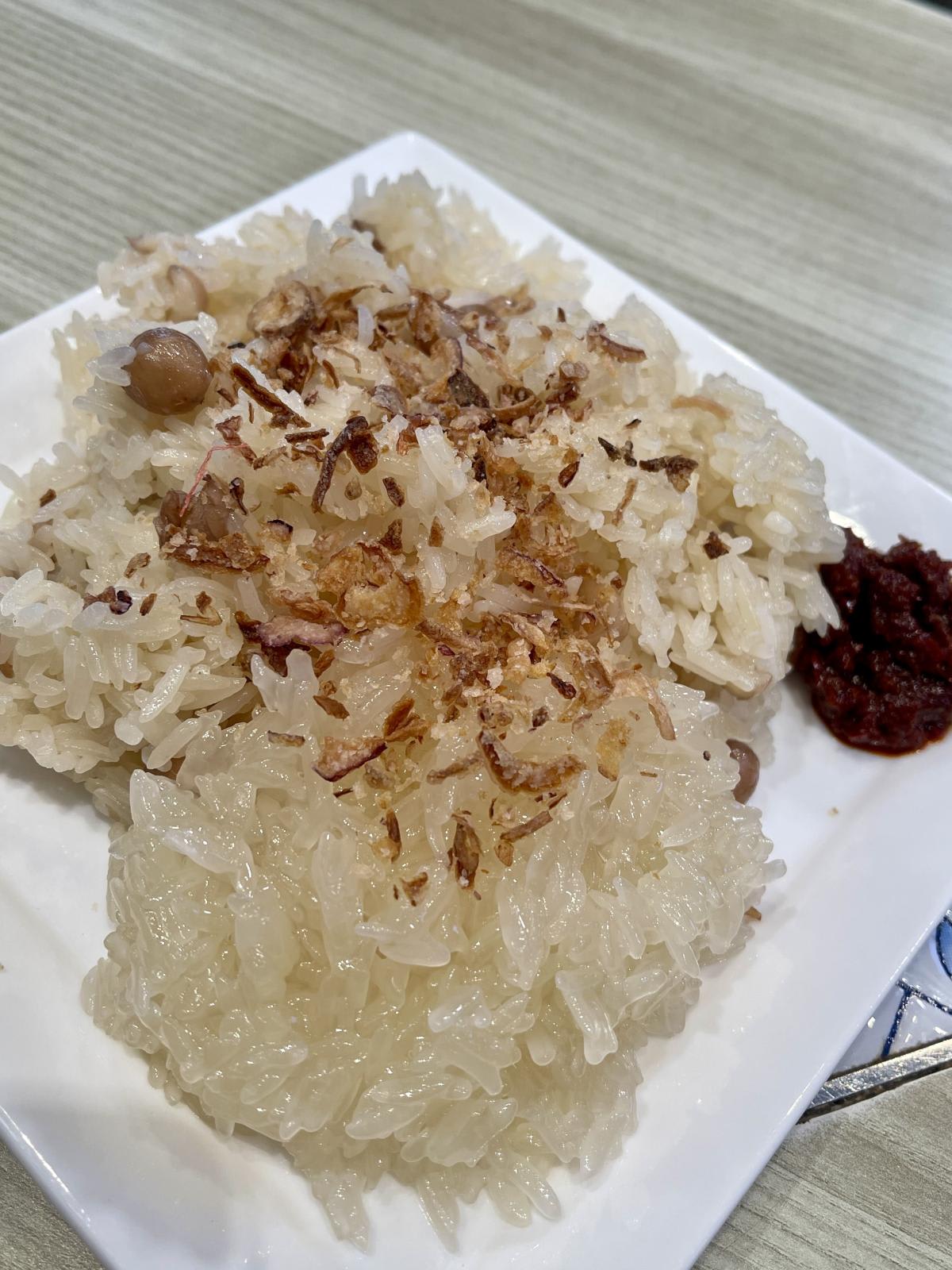 Glutinous rice was soaked overnight, drained and dry-steamed for up to an hour, then stir-fried in vegetable oil with peanuts. Garnished with crispy shallots, a dollop of sambal and a side of sweet glutinous rice, the dish looked deceptively plain.