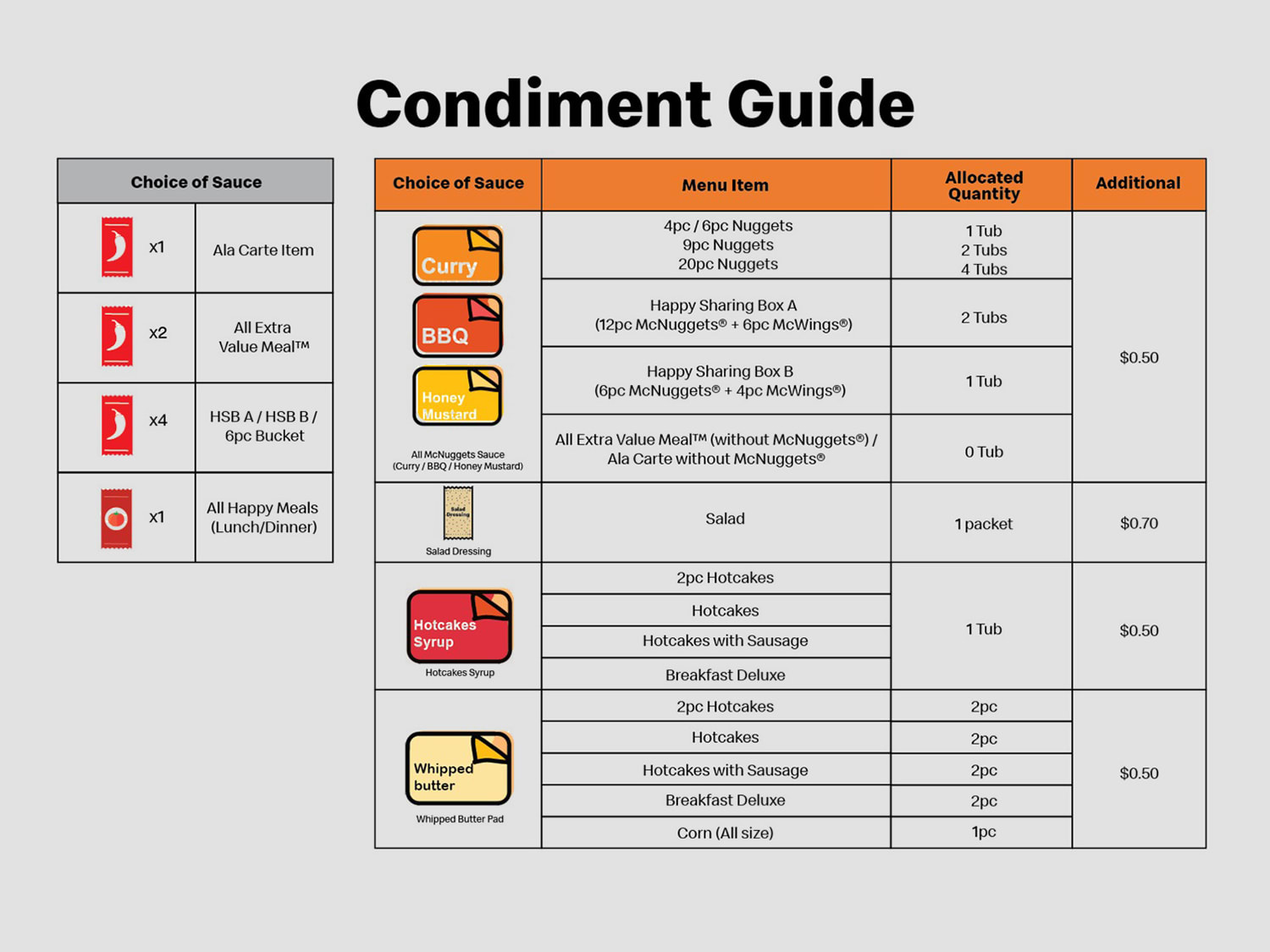 For instance, an order of six-piece nuggets will come with one tub of curry sauce (or BBQ or honey mustard) provided free. If a customer wants to request more sauce, they will need to pay 50 cents per additional tub.