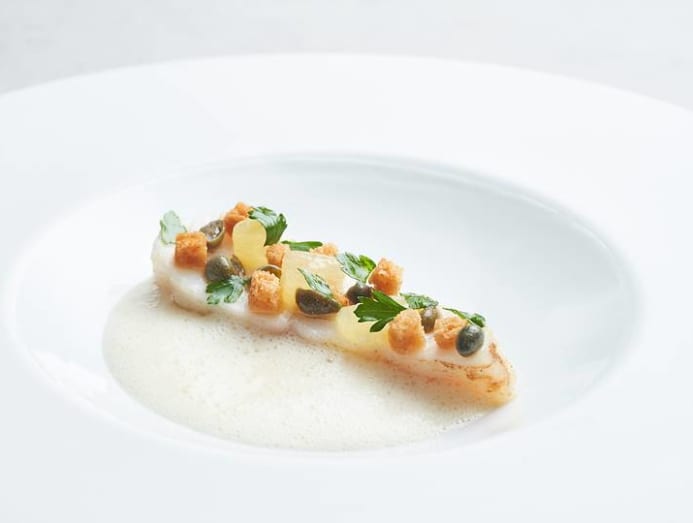 For the dinner, he’s presenting a dish of wild turbot from Brittany, one of his favourite fish to work with. He brines it, then poaches it in French butter, serving it with Jerusalem artichoke puree finished with a mussel beurre blanc.