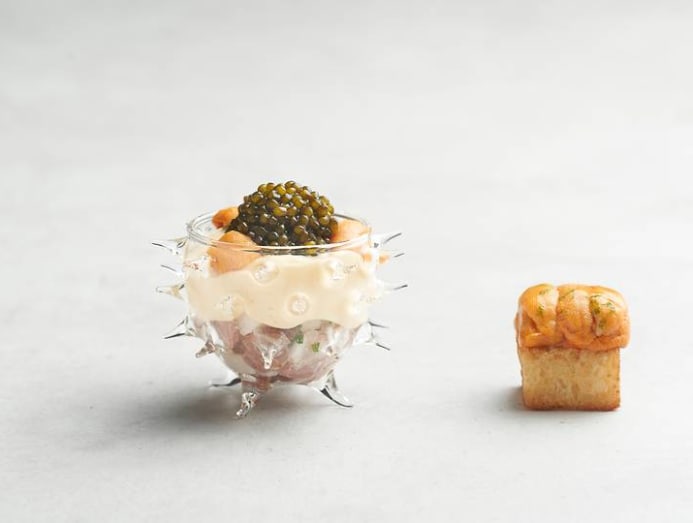 Instead of serving it in its shell, he’ll serve Hokkaido uni in a spiked glass bowl instead, with Osaka sardine tartare smoked with cherry wood for some unctuous fattiness, and finger lime that’s also from Japan. It’s topped with uni-infused mussel foam and Kristal caviar. “There’s a twist on the flavour, but the dish looks almost the same,” he explained.