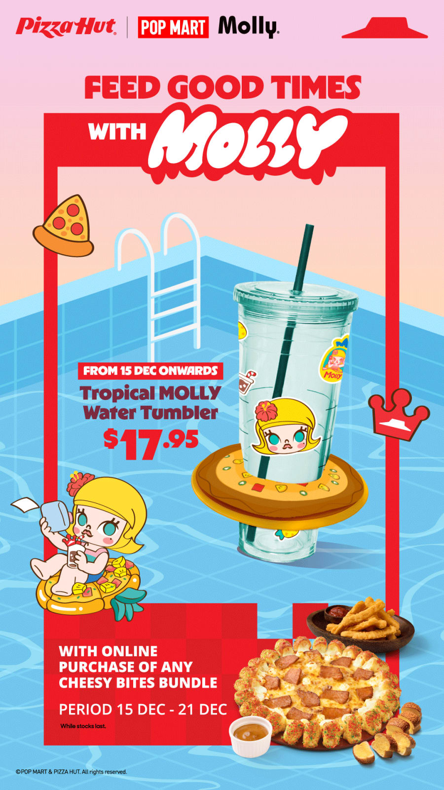 Pop Mart fans, here's how you can end this year with exclusive merchandise. Pizza Hut Singapore is collaborating with the toy company to launch accessories themed after the popular Molly character this month. These include a Molly-themed tumbler, themed tote bags, a keychain and a pop socket.
