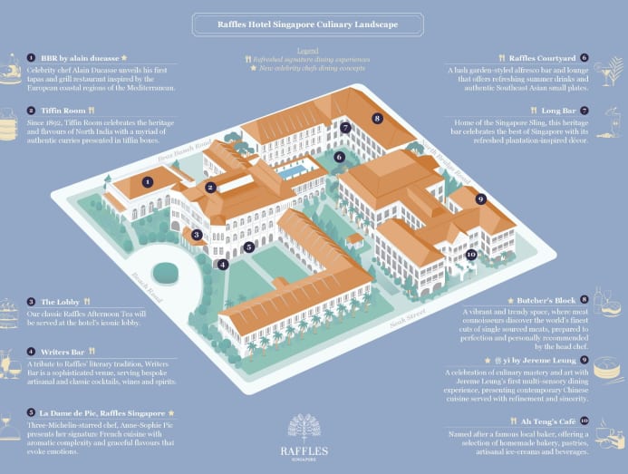 Six other bars and restaurants will be making its return at Raffles Hotel, including the North Indian dining spot Tiffin Room; heritage bar Long Bar, with its iconic Singapore Sling cocktail; The Lobby; Writers Bar; Raffles Courtyard; and the newly renamed Ah Teng’s Cafe.