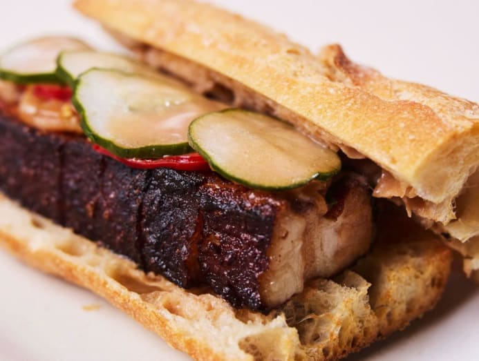 A thick slab of tamarind-infused deep-fried pork belly – crisp-edged and tender inside – is tucked into a six-inch crackly baguette with a soft, focaccia-like crumb, and finished simply with pickled cucumber and sambal matah (a Balinese raw chilli-based condiment). The flavours are bright and sharp, reminiscent of a banh mi with a local twist.