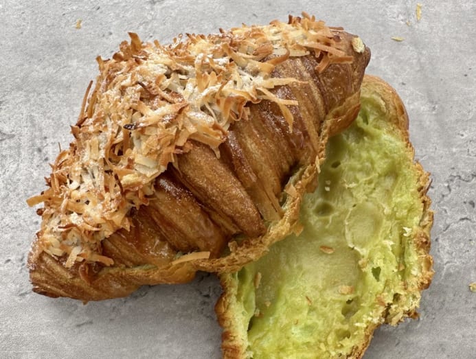 This pandan-flavoured croissant is twice-baked (a process that involves stuffing the croissant with a luscious filling, kaya butter in this case, and baking it again to make it crispy). It is decorated with almond cream and toasted coconut flakes.