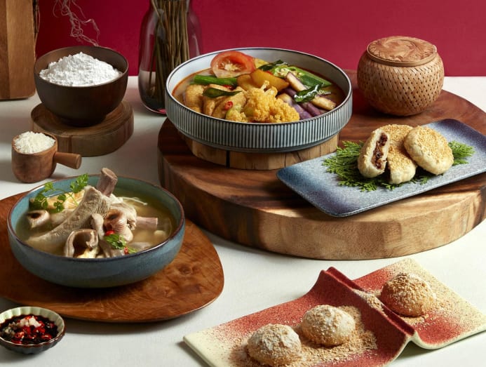 - Lingzhi Vegetarian – The seven-course A Taste of Home set menu, priced at S$60 per person, features inventive vegetarian creations, including vegetarian chilli crab buns and “bak kut teh” with turmeric noodles, as well as a bobo cha cha crispy taro puff.
