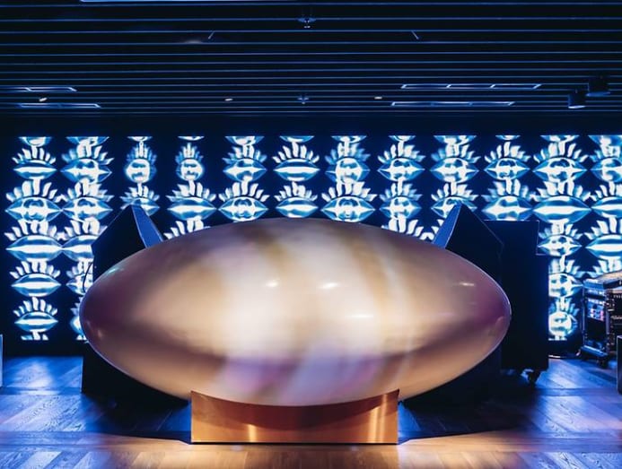 In the next room, what used to be the dance floor is now a dining room that seats up to 100 people at low-slung tables flanked by dark sofas. A fancy screen on the ceiling throws groovy swirls of coloured light across the room while we dine.