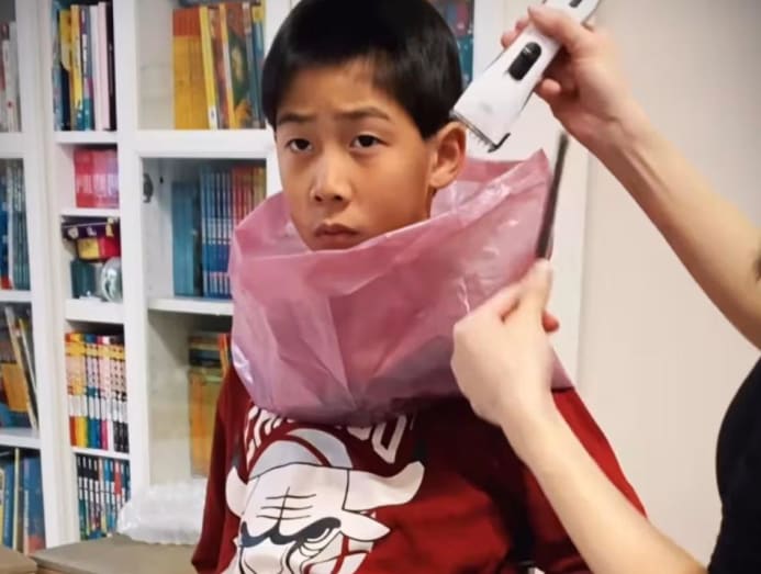 In the video, Pang, armed with a hair clipper, starts buzzing away at Aden's fringe. Let's just say the boy looked less than thrilled.