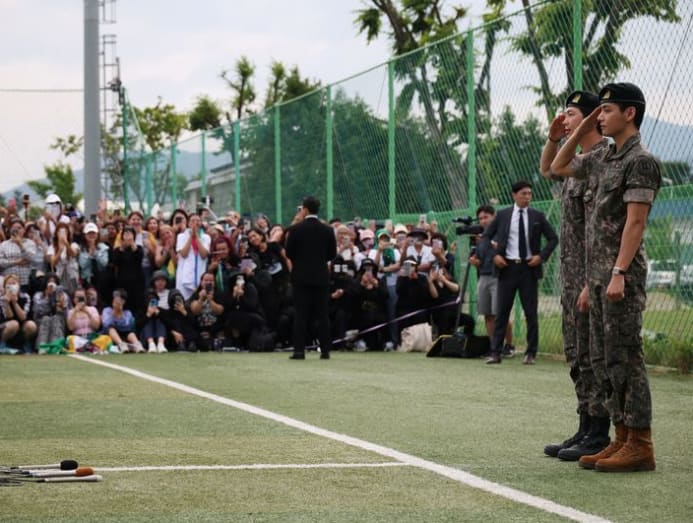 Cheered by dozens of fans near the military base, the two members in their army uniforms saluted the crowd and said they will soon be returning to perform.