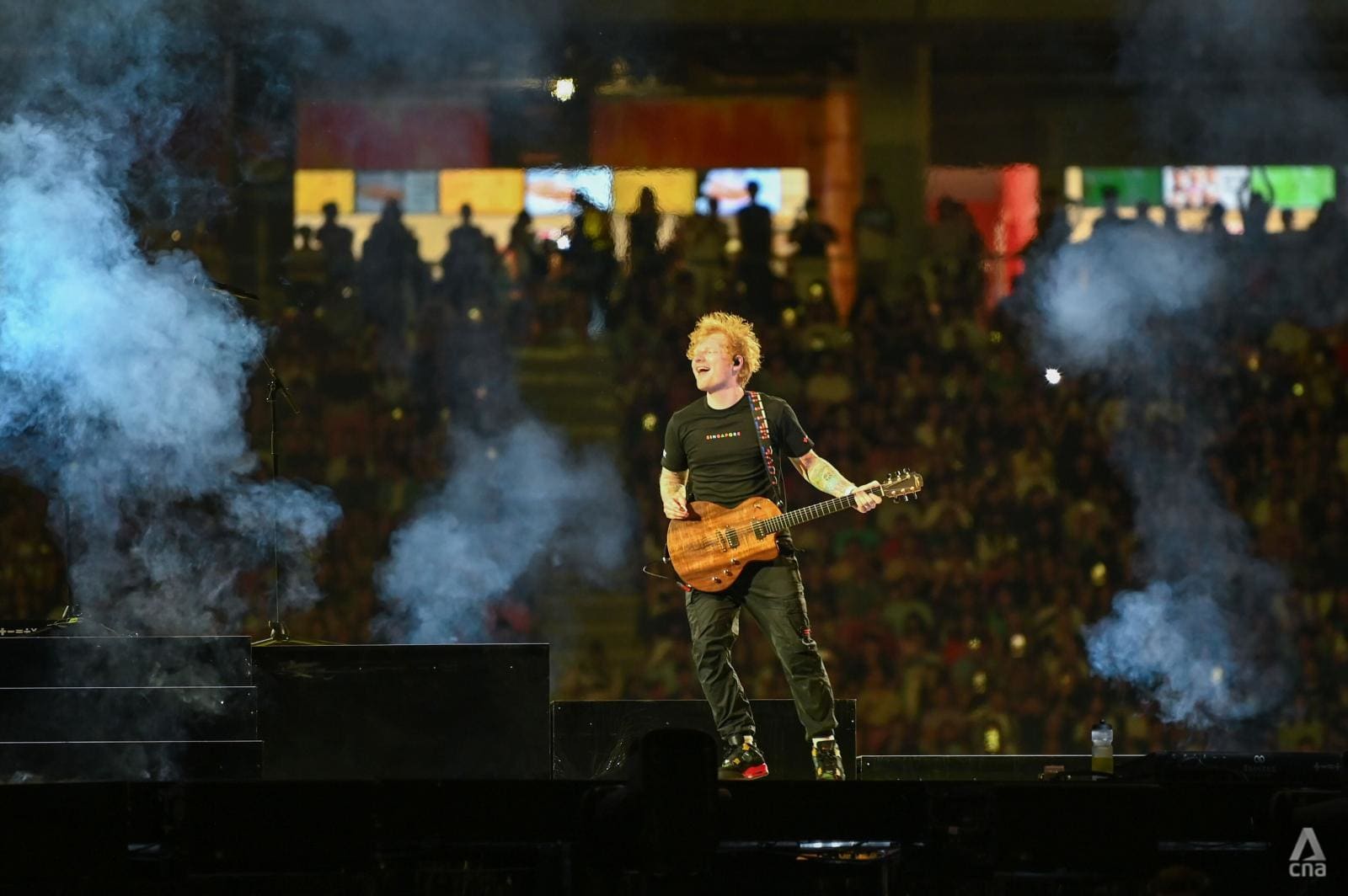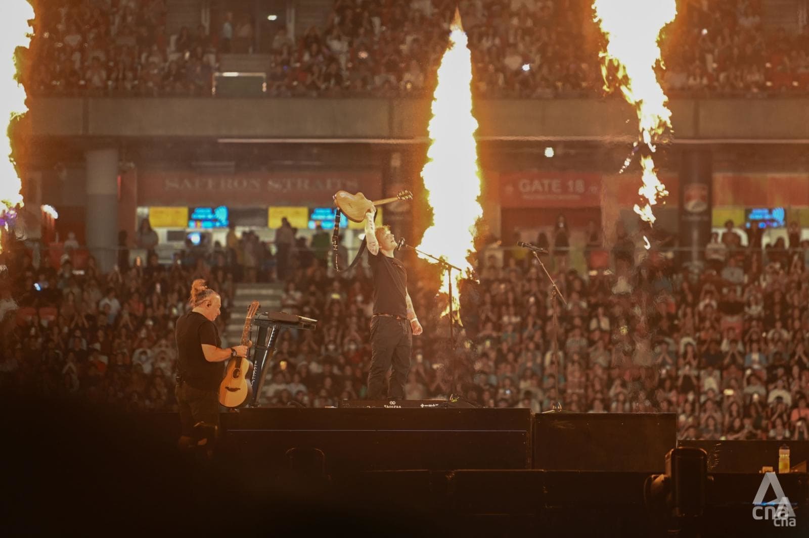 On cue, the stage lit up as Sheeran took the spotlight, playing the opening riffs of Tides.