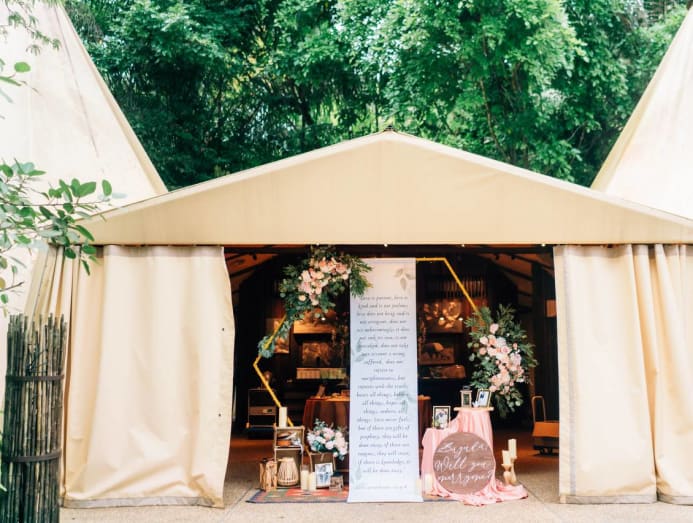 There was supposed to have been an outdoor setup with flowers, decorations and a cake, but because of the rain, Night Safari staff rushed to move everything inside a tent.