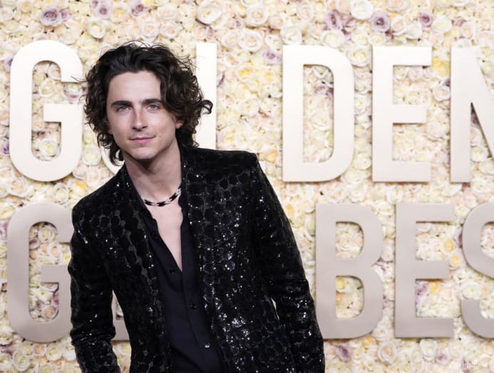 Fashion risk-taker Timothée Chalamet, the latest “Wonka,” donned a bedazzled black jacket with black skinny trousers and a low-buttoned black shirt. His designer: Celine Homme.
