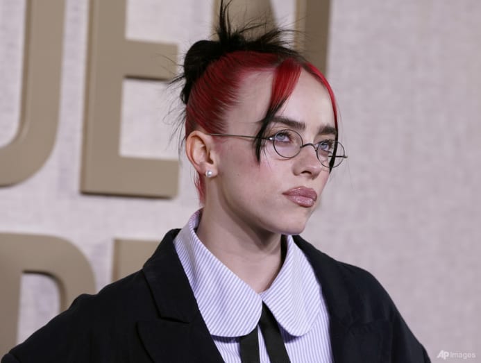 Billie Eilish, her hair bright red and black, went school marm in a white blouse, brown skirt and an oversized black jacket, eyeglasses in place. Her look was by Willy Chavarria.