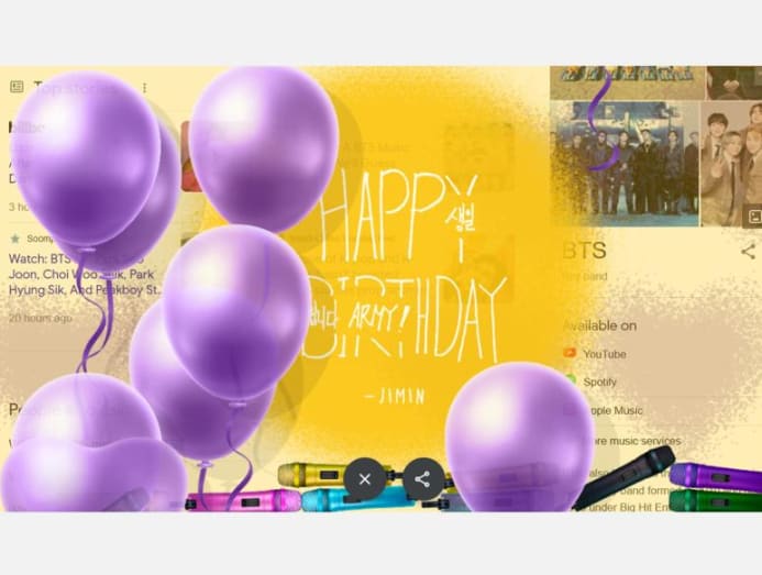 If you’re a BTS fan, here’s something you can do on Google for a bit of fun. Type “BTS” on Google mobile or desktop, click on the purple heart and your screen will be filled with animated balloons. Some of the virtual balloons contain a microphone and if you click on them, you’ll get a “I purple you” message from one of the seven band members.