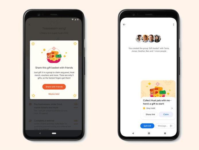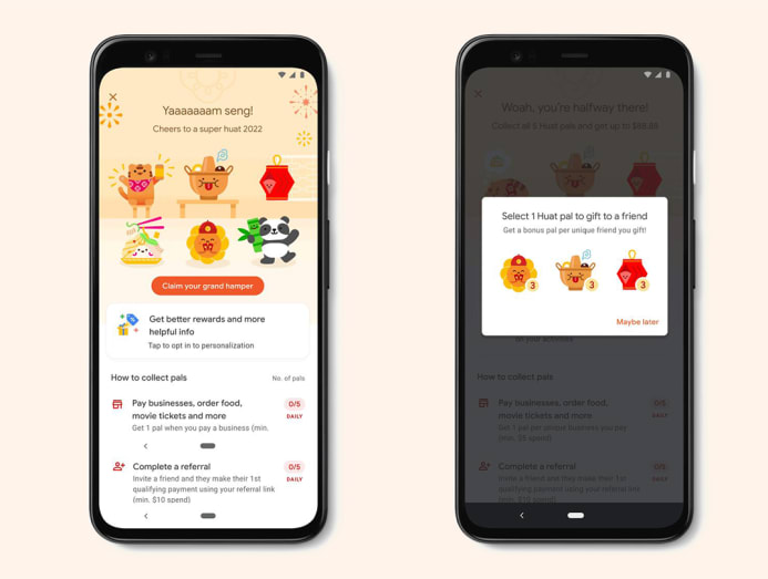 - Refer new users to Google Pay who make their first qualifying payment of S$10 and above Gift Huat pals characters to friends