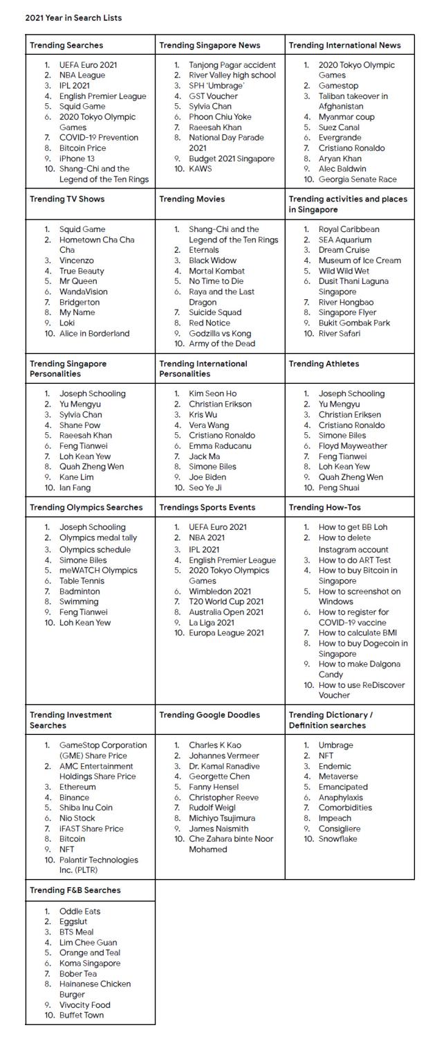 Sports also featured strongly in the Top Trending Searches list, with the UEFA Euro 2021, NBA League, India Premier League and English Premier League taking the top four places and the Tokyo Olympics ranking sixth. Local athletes like Joseph Schooling, Yu Mengyu, Loh Kean Yew and Quah Zheng Wen also appeared in several of the lists.