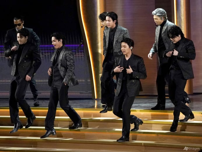 Dressed in all black, BTS took the stage with a flirty moment between V and Rodrigo before the group performed their hit single Butter. They made an appearance after one of the members tested positive for COVID-19. All seven of the members – Jin, Jimin, V, RM, J-Hope, Suga and Jungkook – acted as if they were secret agents with neon-blue lasers, dancing with smooth choreography before going into a brief rap portion of the song.