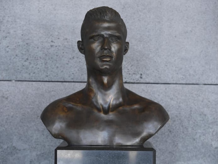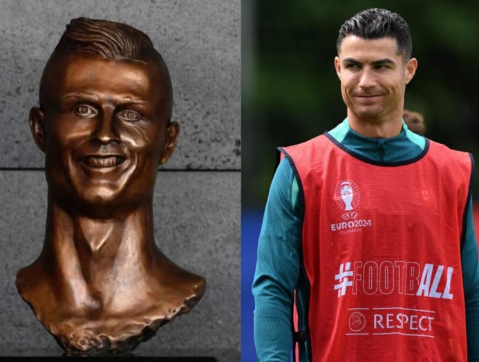 From left: Harry Kane posing with his statue, and a bronze bust of Portugese footballer Cristiano Ronaldo which received much criticism when it was unveiled in 2017. (Photos: Instagram/harrykane, AFP/Francisco Leong)