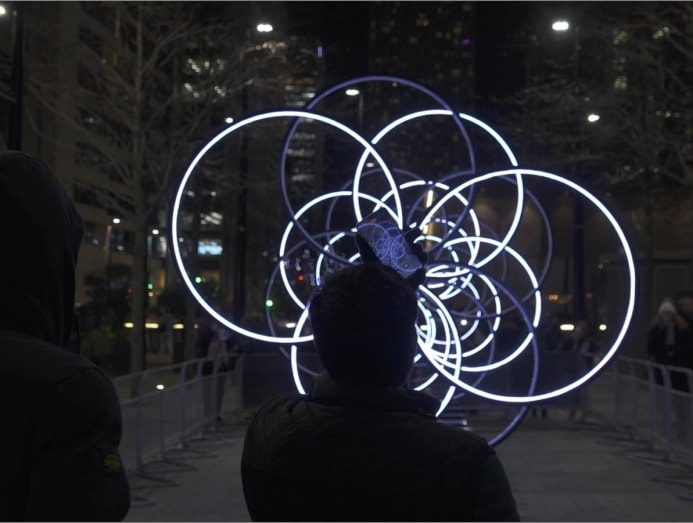 This artwork features the Modern Guru – a translucent ovoid with four imposing large digital eyes suspended above a spiralling ring of LEDs. It was designed by Australia-based art and technology studio ENESS, and is a commentary on the role that technology plays in shaping perceptions of fulfilment in the digital age.