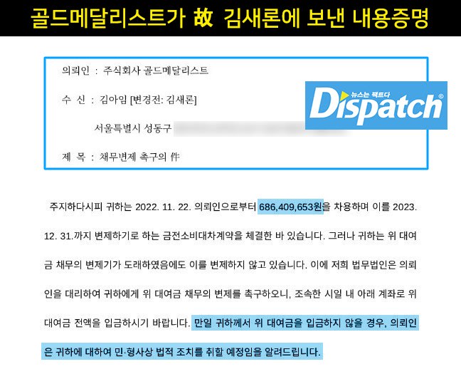 South Korean news outlet Dispatch has also released additional materials including the certified letter sent by Gold Medalist which demanded payment from Kim Sae-ron. The document wrote that if the loan was not paid in full, civil and criminal legal action would be taken.