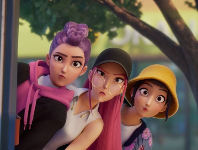 This image released by Netflix shows characters Zoey, from left, Rumi and Mira in a scene from KPop Demon Hunters. (Netflix via AP)
